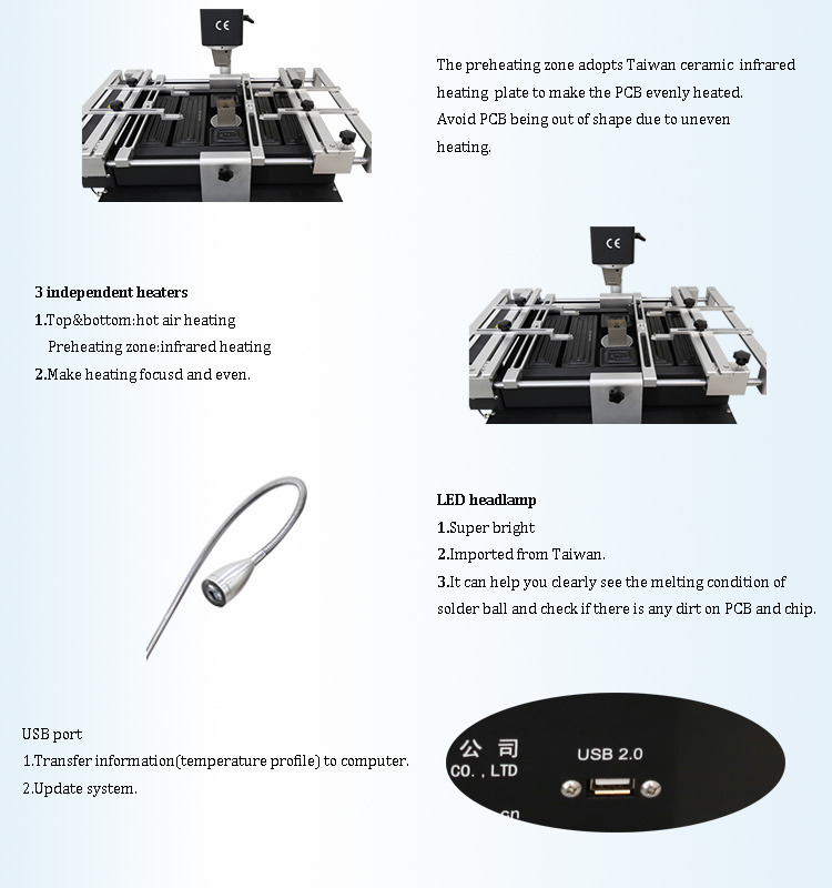 rding til mismunandi BGA. Ferilgreining, stilling og aðlögun er einnig aðgengileg með snertiskjá. Þrjú hitasvæði samþykkja inn-
